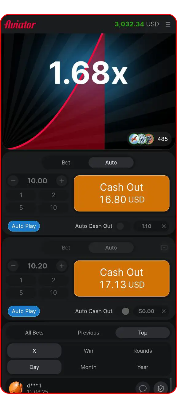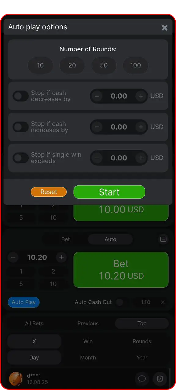 - Auto-cashout: Automatically cashes out your bet at a preset multiplier